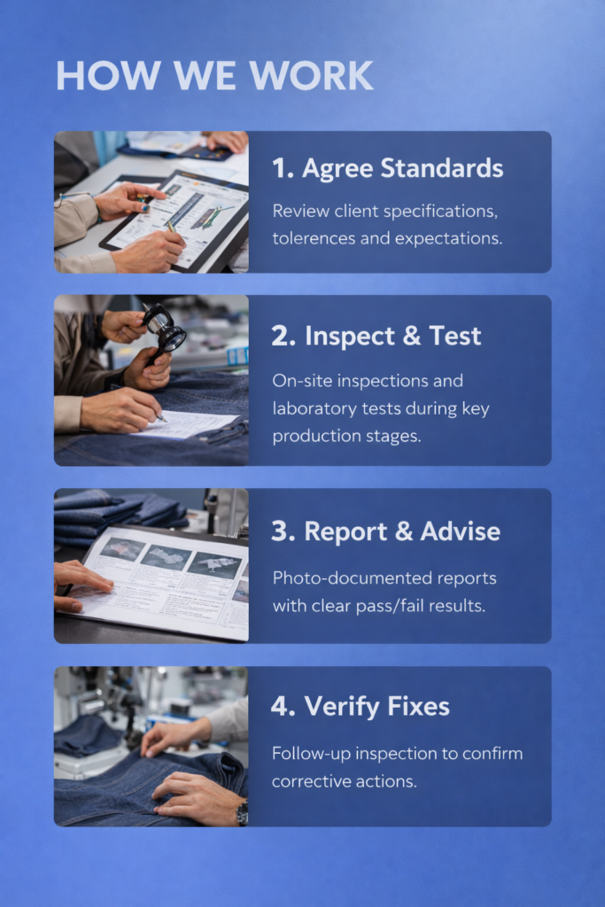 Professional inspections, laboratory testing and factory audits to ensure consistent, durable and compliant denim products from fabric intake to final shipment.